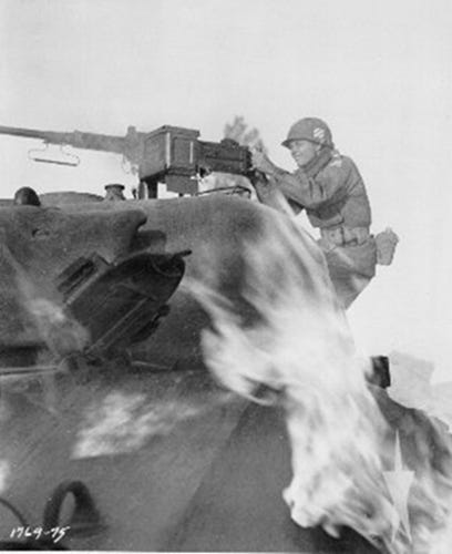 While covering the men of his company near Holtzwihr, France, Texan 2nd Lt. Audie Murphy killed more than 240 German soldiers and destroyed 6 tanks. For this and other courageous actions, Murphy became the most decorated American soldier of WWII.